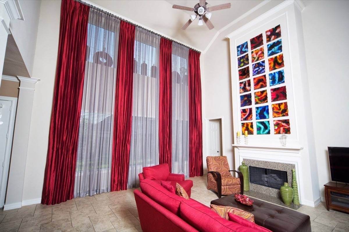 “We had a family gathering coming up and wanted a new look. My wife’s vision for our modern twenty-six foot tall window was a treatment that would go from the ceiling to the floor. The sheer length of it made it a massive project, but we didn’t want it look heavy or weigh down the room. Caron walked us through all kinds of fabric, color, and layering choices. She really put her finger on exactly what we wanted. The layers of red silk, sheers, and metallic really transformed everything…and we get so many compliments from all thirty-six of my family members (and other friends and neighbors, too) on the bold, contemporary look!”